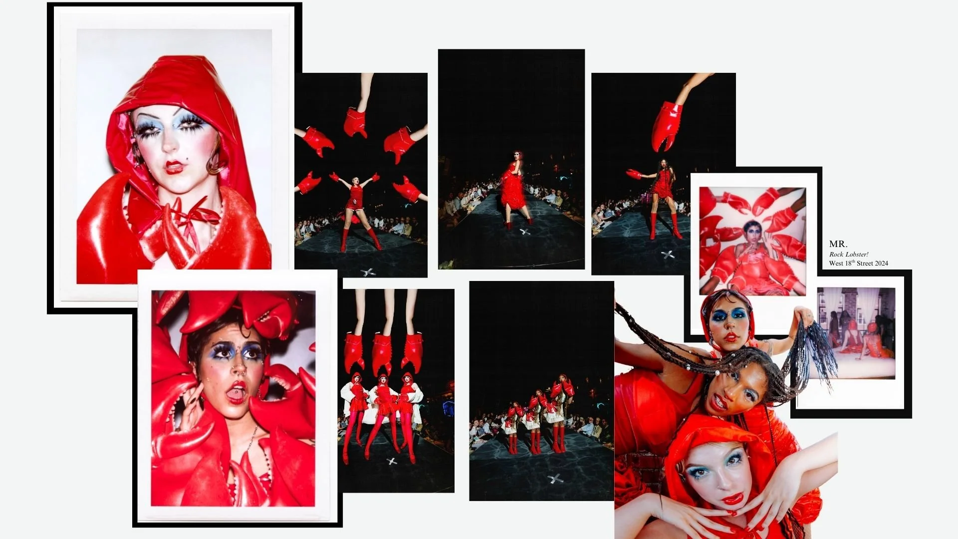 Collage featuring models in bold red outfits, with lobster claws. Images include close-up portraits and runway shots. Models have dramatic makeup, including blue eyeshadow. Background shows photos of collection from West 18th Street Fashion Show.