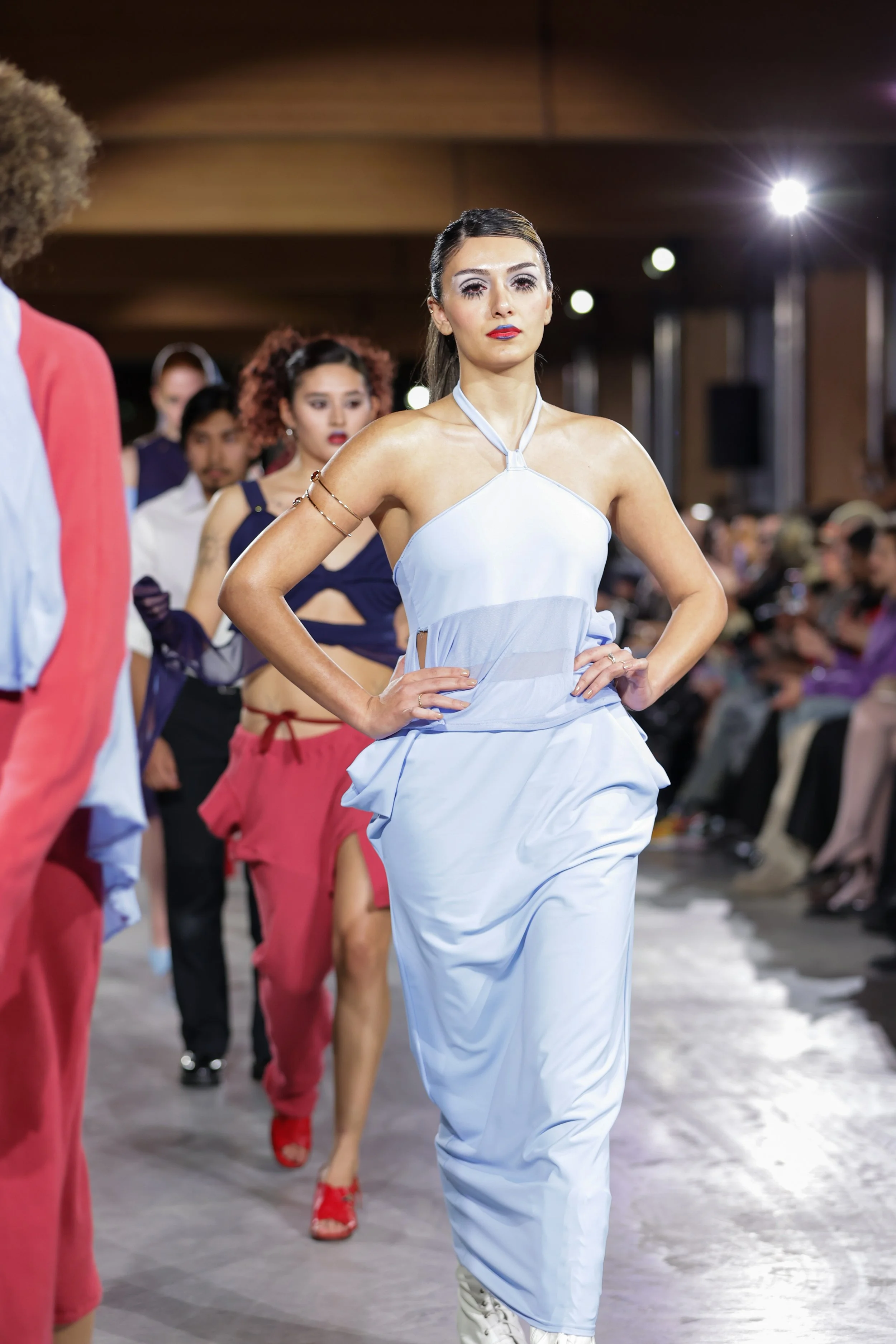 A ethereal two-piece set featuring draped side cowls on the halter top and wrap skirt with adjustable side straps. One of one.